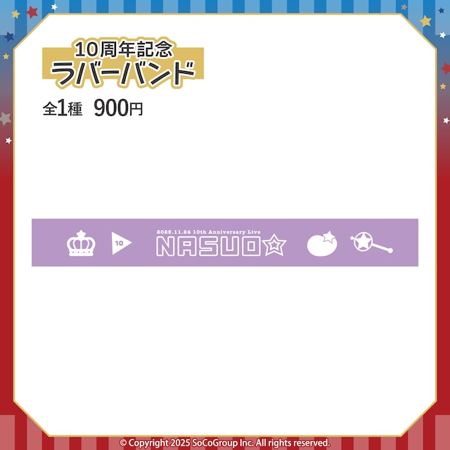 【 なすお☆10周年記念ライブ限定グッズ 】 10周年記念ラバーバンドの オンライン販売決定しました!!! 販売期間:12月22日19:00~1月7日23:59 11/24に開催されたワンマンLIVEのグッズが 数量限定でオンラインに登場!!! ーーーーーーーーーー 今回だけのスペシャルラバーバンド...♪ デザインはなすお☆特製のスペシャル仕様です! ーーーーーーーーーー 仕様:幅25mm ※こちらの商品は売切次第終了となります。 ※発送は2月下旬を予定しております。 ※ご注文後のキャンセル・返品はご遠慮いただいております。